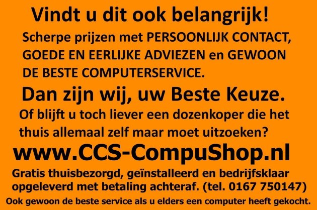 Als het om service en kwaliteit gaat, staat CCS geheel tot uw beschikking, voor zowel ... particulieren als het MKB. Voor vele diensten bent u bij ons aan het juiste adres en heeft u elders een computer gekocht waar u nu problemen mee heeft........ dan komen wij ook gewoon bij u op thuislocatie deze problemen oplossen.